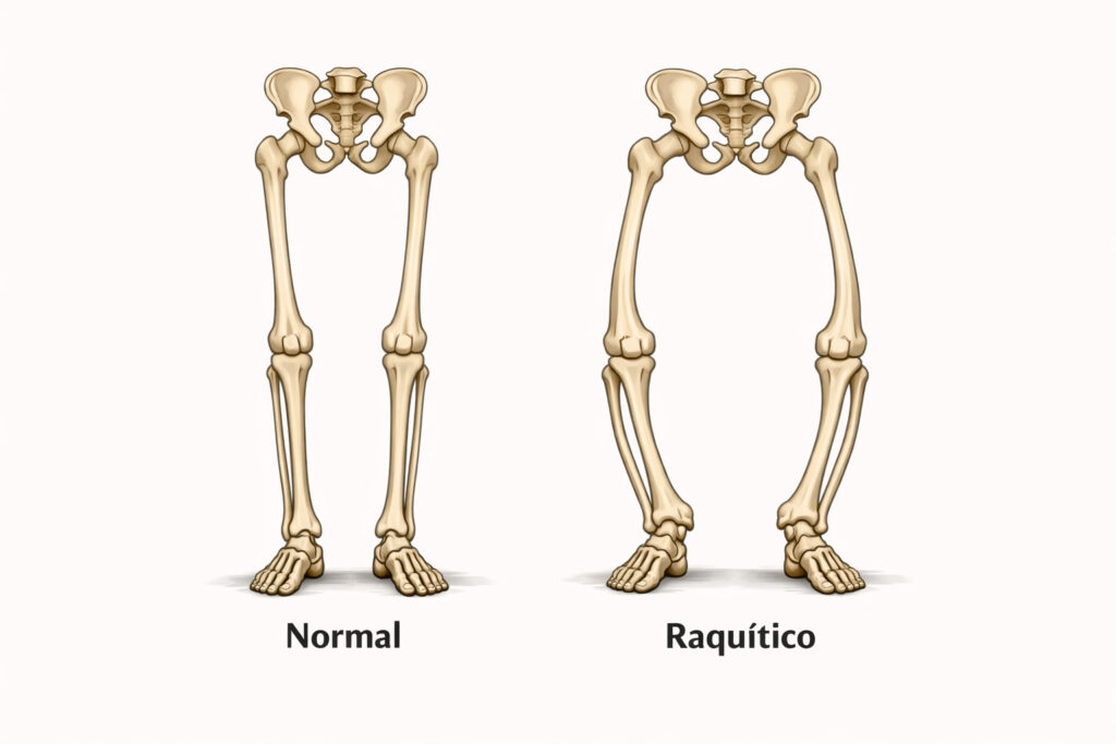 El raquitismo es la alteración de la mineralización de los huesos por falta de vitamina D y calcio y fósforo en la etapa de desarrollo y crecimiento. Los huesos raquíticos, blandos y flexibles, no pueden soportar las tensiones y cargas habituales del cuerpo y se arquean, dando lugar a esas piernas torcidas que vemos a veces.